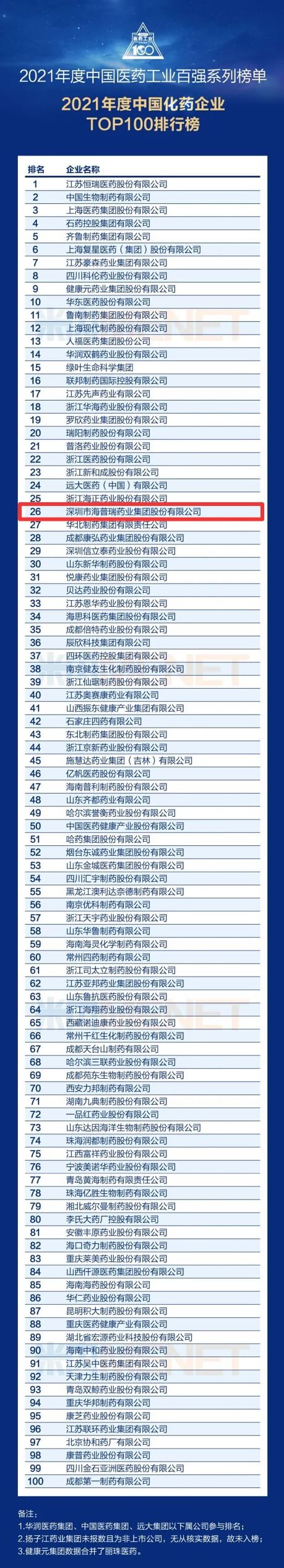 (2022年7月14日,中國深圳)近日,由米內(nèi)網(wǎng)主辦的2022年中國醫(yī)藥健康產(chǎn)業(yè)共生大會在浙江湖州拉開帷幕。大會發(fā)布了“2021年度中國醫(yī)藥工業(yè)百強系列榜單”。該榜單依托米內(nèi)網(wǎng)在中國獨家開發(fā)運行多年的三大終端六大市場終端格局數(shù)據(jù)庫,針對醫(yī)藥工業(yè)企業(yè),從兩大最重要的維度——創(chuàng)新驅(qū)動力和專業(yè)推廣力出發(fā),并且由中國醫(yī)藥工業(yè)百強排行榜專家委員會評選而出。其中,深圳市海普瑞藥業(yè)集團股份有限公司(以下簡稱“海普瑞”)入選“2021年度中國化藥企業(yè)TOP100排行榜”,位居第26位。